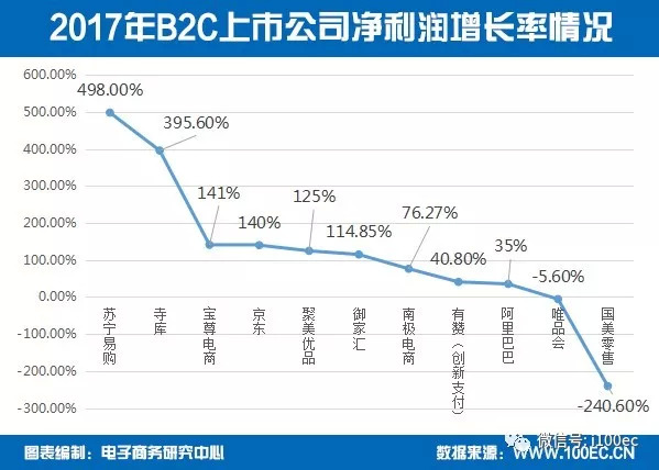 据电子商务研究中心监测数据显示,2017年中国B2C上市公司净利润增长率排名情况分别为:苏宁易购498%、寺库395.6%、宝尊电商141%、京东140%、聚美优品125%、御家汇114.85%、南极电商76.27%、有赞40.8%、阿里巴巴35%、唯品会-5.6%、国美零售-240.6%。