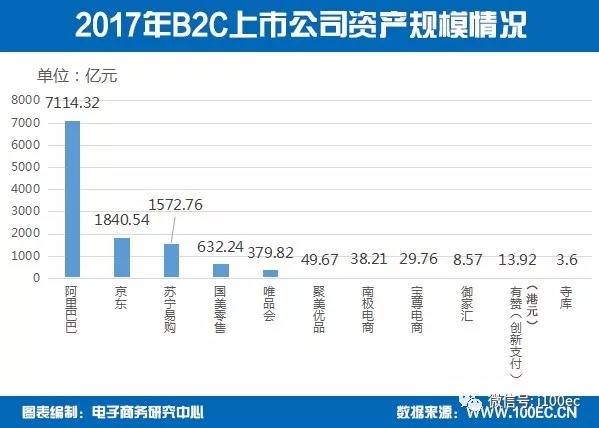 据电子商务研究中心监测数据显示,2017年中国B2C电商上市公司总资产排名为:阿里巴巴7114.32亿元、京东1840.54亿元、苏宁易购1572.76亿元、国美零售632.24亿元、唯品会379.82亿元、聚美优品49.67亿元、南极电商38.21亿元、宝尊电商29.76亿元、御家汇8.57亿元、有赞13.92亿元、寺库3.6亿元。