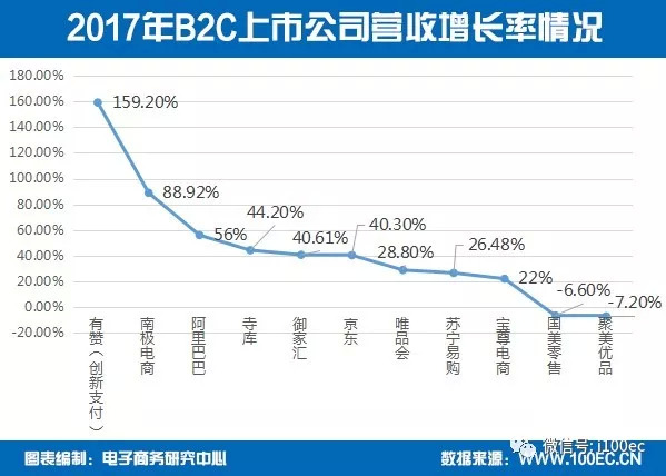 据电子商务研究中心(100EC.CN)监测数据显示,2017年B2C电商上市公司营业收入增长率排名情况为:有赞159.2%、南极电商88.92%、阿里巴巴56%、寺库44.2%、御家汇40.61%、京东40.3%、唯品会28.8%、苏宁易购26.48%、宝尊电商22%、国美零售-6.6%、聚美优品-7.2%。