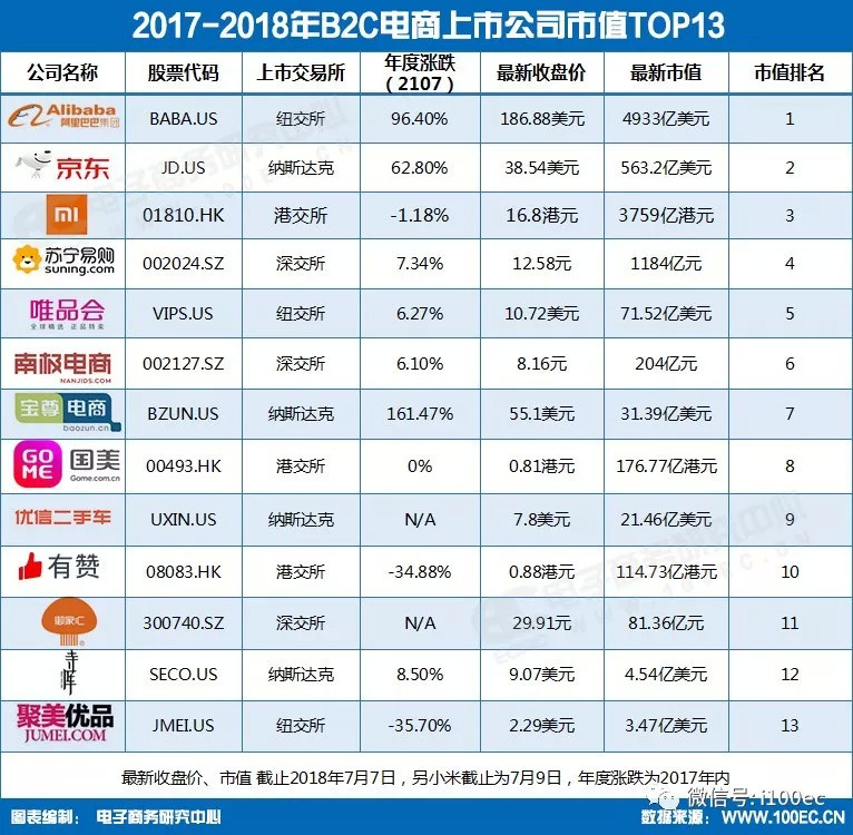 据电子商务研究中心监测数据显示,截止到2018年7月7日,B2C电商上市公司中市值排名前十三的分别是:阿里巴巴(4933亿美元)、京东(563.2亿美元)、小米(3759亿港元,截至2018年7月9日)、苏宁易购(1184亿元)、唯品会(71.54亿美元)、南极电商(204亿元)、宝尊电商(31.39亿美元)、国美零售(176.77亿港元)、优信(21.46亿美元)、有赞(114.73亿港元)、御家汇(81.36亿元)、寺库(4.54亿美元)、聚美优品(3.47亿美元),这十三家企业总市值达28984.36亿元。