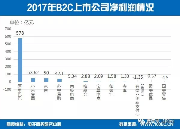 据电子商务研究中心监测数据显示,2017年中国B2C电商上市公司净利润排名为:阿里巴巴578亿元、小米集团53.62亿元、京东50亿元、苏宁易购42.1亿元、南极电商5.34亿元、唯品会2.88亿元、宝尊电商2.09亿元、御家汇1.58亿元、寺库1.33亿元、聚美优品亏损0.37亿元、有赞亏损1.35亿元、国美零售亏损4.5亿元。