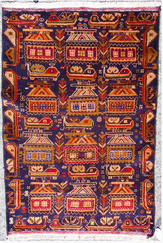 坦克、直升飞机、手榴弹、火箭筒和卡拉什尼科夫的AK步枪开始渗透到这项百年传统手艺中,成为地毯上的背景元素或是特殊标志。“我最喜欢老式Beluch风格的地毯,”49岁的美国企业家凯文·苏迪思(Kevin Sudeith)表示,“这种设计可以追溯到19世纪,地毯两端分别有两架直升机和两辆坦克。”