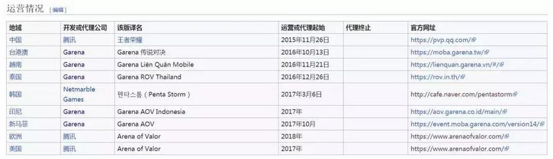 从2016年开始,AOV在港澳台和东南亚地区先后由Garena代理发行,韩国由Netmarble Games 代理发行,美国和欧洲由腾讯自己代理发行,版本都是统一的AOV国际版。
