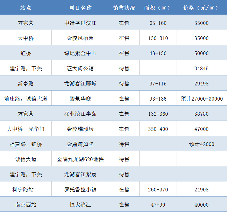 近段时间,关于南京地铁建设的话题热度不断升高,7月17日,《南京地铁》又发布关于南京各条在建地铁线路的最新动态,进一步提高市场对新增地铁沿线的楼盘热度。地铁建设一方面对板块内的交通出行带来便利,另一方面也为板块楼盘保值增值提供基础。以下为界面楼市南京站统计各站点沿线楼盘最新项目信息。