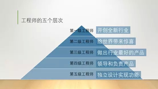 他们能够开创一个全新的行业,就像爱迪生开创电器行业、福特开创汽车行业,诺伊斯开创半导体行业这样的。通过这个分类其实是为了给大家传递一个概念,什么叫作一名好的工程师?我们这辈子如果能够达到一个第三级的工程师就是很好的成就和目标了,我们需要自己给自己设立这样的一个目标,让自己在工程实践中不断提升自己,达到目标。