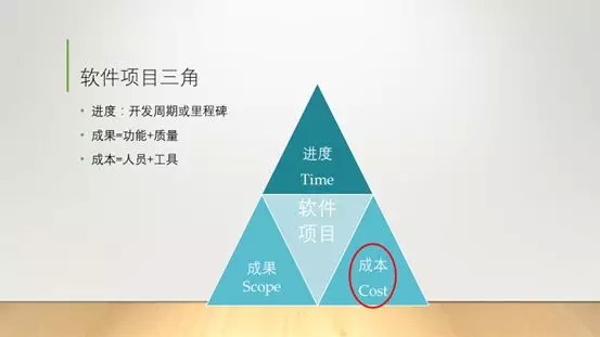 软件项目有一个项目三角,互相制约,此消彼长。比如,成果固定的情况下,需要进度快,那么成本就需要增加,需要增加工程师。这是一个相互制约的过程。我们现在还是一个初创团队,那么成本是我们的最大的制约项。我们和BAT是不一样的,对于BAT来说,功能和质量(即成果)是最重要的,因为他们面临的挑战和竞争是我们无法想象的,而进度可以相对容易的通过增加成本解决。