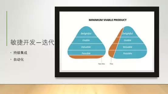 刚才的瀑布模型是一个很传统的老掉牙的流程了,很少有人在用。所以并不是我想要讲的。现在更多推崇的是一个叫做“敏捷开发-迭代”的开发过程,这个是我要讲的。敏捷开发是以功能为中心的,每一个功能开发完成之后就马上有成果、可验证。互联网开发要求需要敏捷。