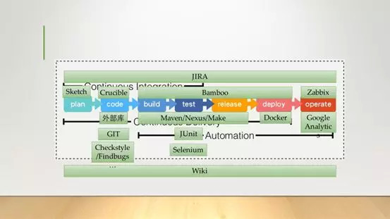 这个图是非常重要的,基本就是我们现在在使用的流程。持续集成和自动化都在这里标识了,在什么环节中需要。持续集成是什么?持续集成的概念就是把所有的成果给放在一起。这是一个集成的过程。比如我们把不同的代码整合到了一起这样的动作是其中一个例子。持续集成就是我们要不断的集成,让产品持续可以看到是什么样的。一会儿我会给大家看一下我们使用的工具。(此处省略了具体的工具讲解,会在更详细的技术培训文档中讲解)