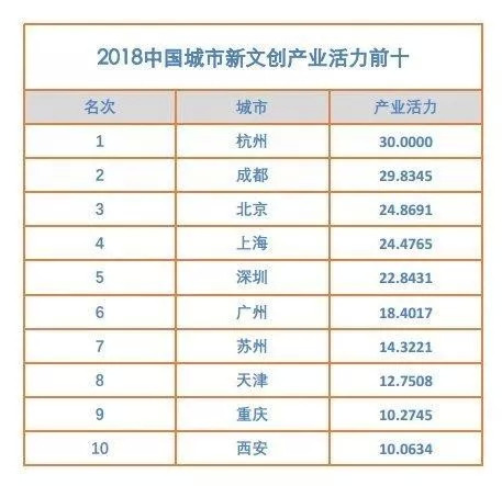 如果以文创产值的总量来算,北上广深一线城市的地位依然是不可撼动的。但产业活力不仅仅体现在总量等规模数据上,更看重的是增长潜力和空间。从增长的情况来看,增加较快的城市为杭州、成都、苏州、重庆等新一线城市。