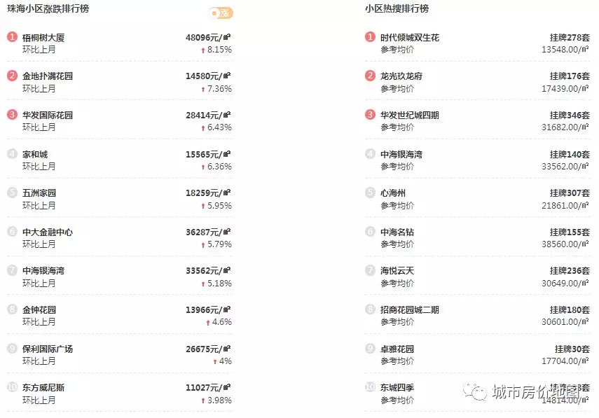 具体小区方面,本月梧桐树大厦、金地扑满花园、华发国际花园摘得小区涨幅榜前三桂冠,环比涨幅分别为8.15%、7.36%、6.43%,包括时代倾城双生花、龙光玖龙府、华发四季城四期在内的小区成为本月热搜TOP小区。