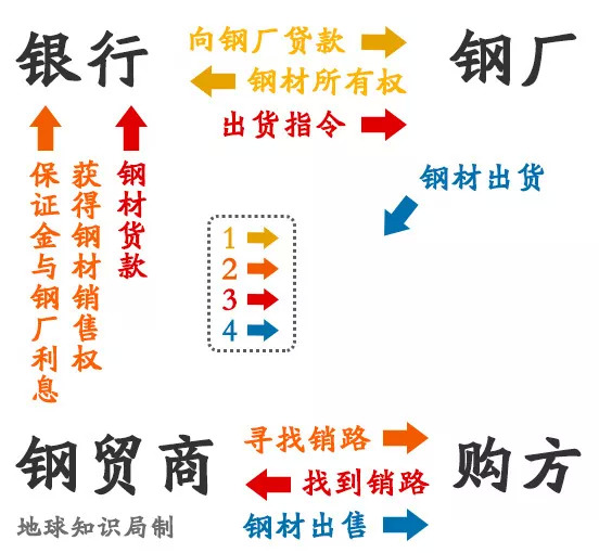 早期钢材行业与银行之间的放贷模式流程很复杂。简单来说,是银行,钢贸商,钢厂签三方协议,银行放钱给钢厂,钢厂产出的钢材所有权始终在银行手上,钢贸商先行支付20%的保证金与钢厂贷款利息,而钢贸商找到销路后,将待售货物的货款转给银行,银行给存储货物的仓库下达相对应吨数的指令,发出货物。