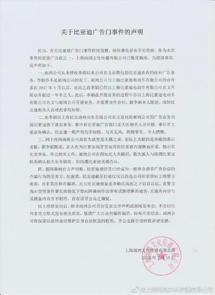 NBD:上海雨鸿文化传播有限公司(下称“雨鸿文化”)跟李娟业务来往比较多,并且比亚迪在声明中表示,2018年4月,李娟使用上海雨鸿公司的名义,以资源赠送及优惠价格的方式,推进比亚迪与阿森纳足球倶乐部之间的广告宣传,李娟跟你提过这家公司吗?