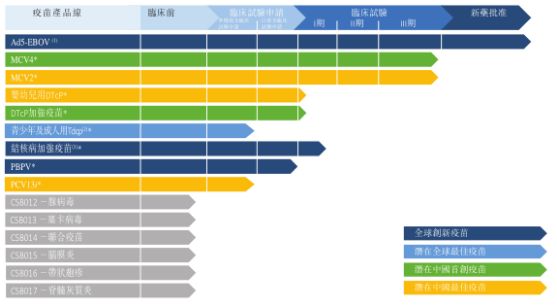 除了预防脑膜炎球菌感染及埃博拉病毒病的三项临近商业化疫苗产品之外,有六种在研疫苗处于临床试验阶段或临床试验申请阶段。
