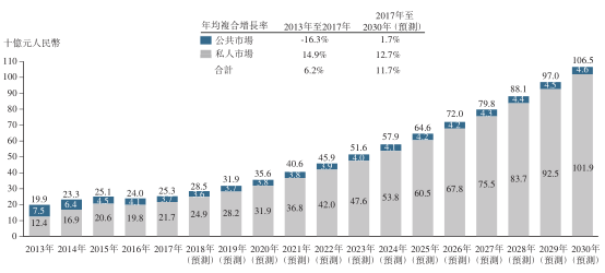 而中国的私人疫苗市场规模由2013年的124亿元人民币增2017年的217亿元人民币,预料将于2030年达到1019亿元人民币。私人疫苗市场占中国疫苗市场总额的百分比预计将由2017年的85.8%增加至2030年的95.7%。