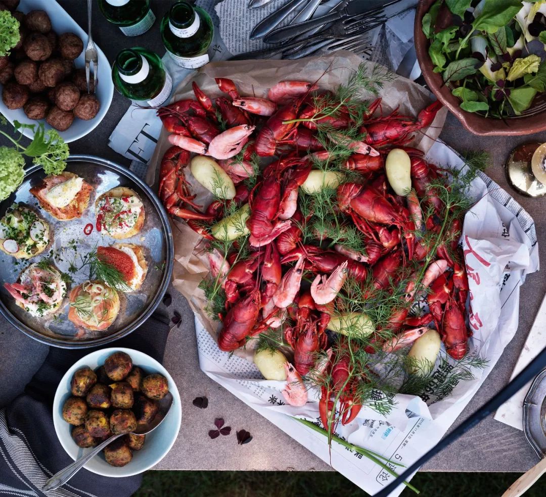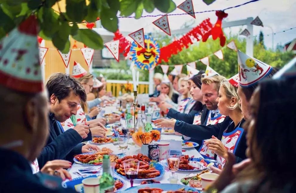 北欧夏天结束得早,一般到了8月,夏天差不多就要过去了。这时候,瑞典人就要开始吃小龙虾了。他们会在户外准备好餐桌,摆上带有小龙虾图案的餐盘、餐垫、纸巾和吃虾工具,再穿戴好吃小龙虾专用的围兜和三角形纸帽。
