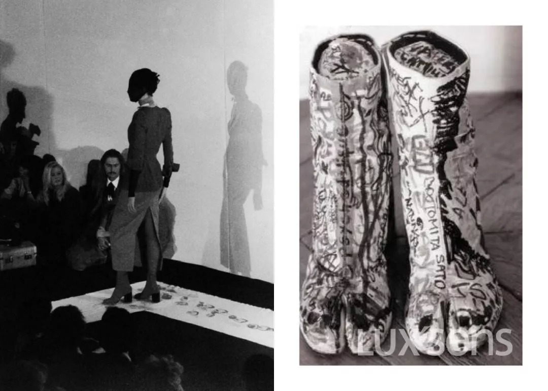 1988 年,MaisonMargiela 发布了第一个系类,也叫做蹄形靴,走秀的 models 脚底沾满了红色颜料,在白色的 T 台上留下脚印。 当时秀场的照片,一直被小编珍藏,总给人一种诡谲莫测的感觉。