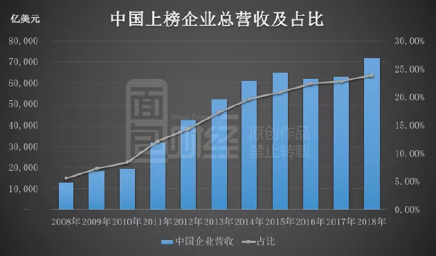 以下为根据《财富》世界500强排行榜整理的中国上榜企业总营收及占比变化: