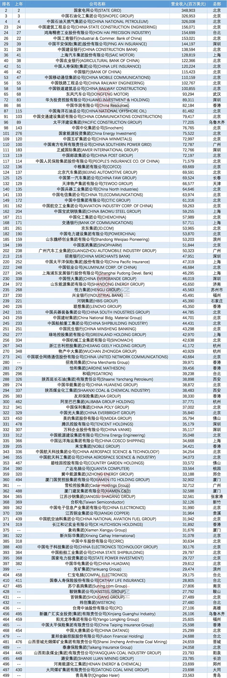 今年新上榜的中国公司包括:招商局集团、雪松控股、象屿集团、兖矿集团、鞍钢集团、首钢集团、纬创集团、台湾中油、中国太平保险集团、富邦金融控股、泰康保险集团(重新上榜)、河南能源化工集团、青岛海尔。
