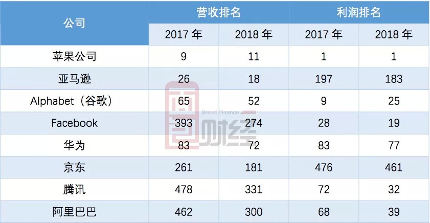 近年来,上榜的互联网公司也越来越多。2016年,京东首次上榜;2017年,腾讯、Facebook、阿里巴巴首次上榜。这些互联网服务公司在今年的排名均有大幅提升。