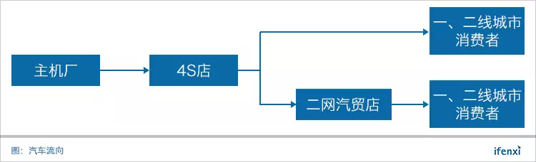 从传统渠道来看,汽车主机厂通过4S店向一二线城市销售新车并提供金融、维保等服务;地级市、县级市的汽车交易市场,则由二网汽贸商从邻近4S店处提车,并运回本地销售。