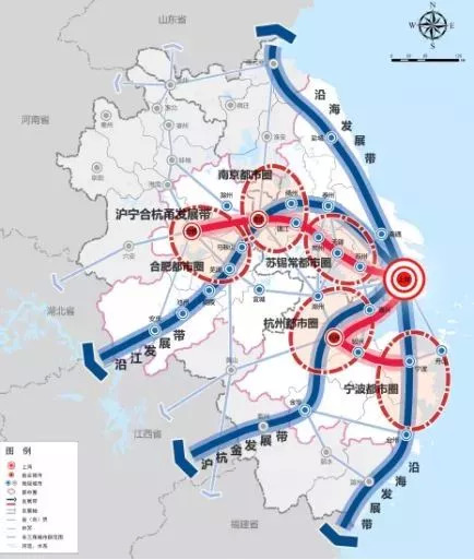 2016年《长江三角洲城市群发展规划》指出:发挥上海龙头带动的核心作用和区域中心城市的辐射带动作用,依托交通运输网络培育形成多级多类发展轴线,推动南京都市圈、杭州都市圈、合肥都市圈、苏锡常都市圈、宁波都市圈的同城化发展,强化沿海发展带、沿江发展带、沪宁合杭甬发展带、沪杭金发展带的聚合发展,构建“一核五圈四带”的网络化空间格局。