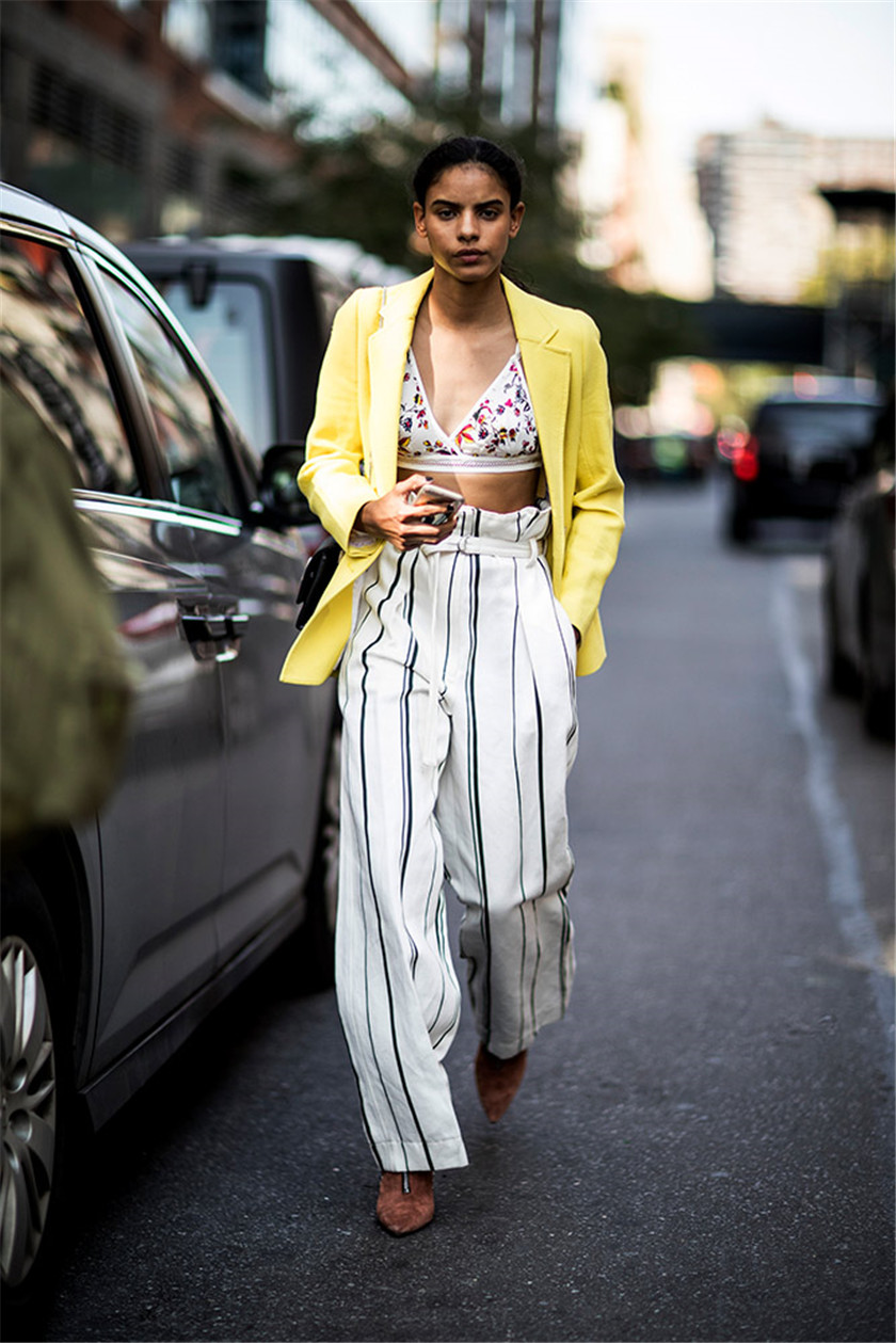 为了让你的“内衣秀”远离卧室的慵懒风,即使你选择了颜色明亮并且有复杂印花Bra,也最好为它穿上一件同样亮色的外套。而此时西装外套的好处就在于他可以将女性纤细的腰身更好的展示出来。
