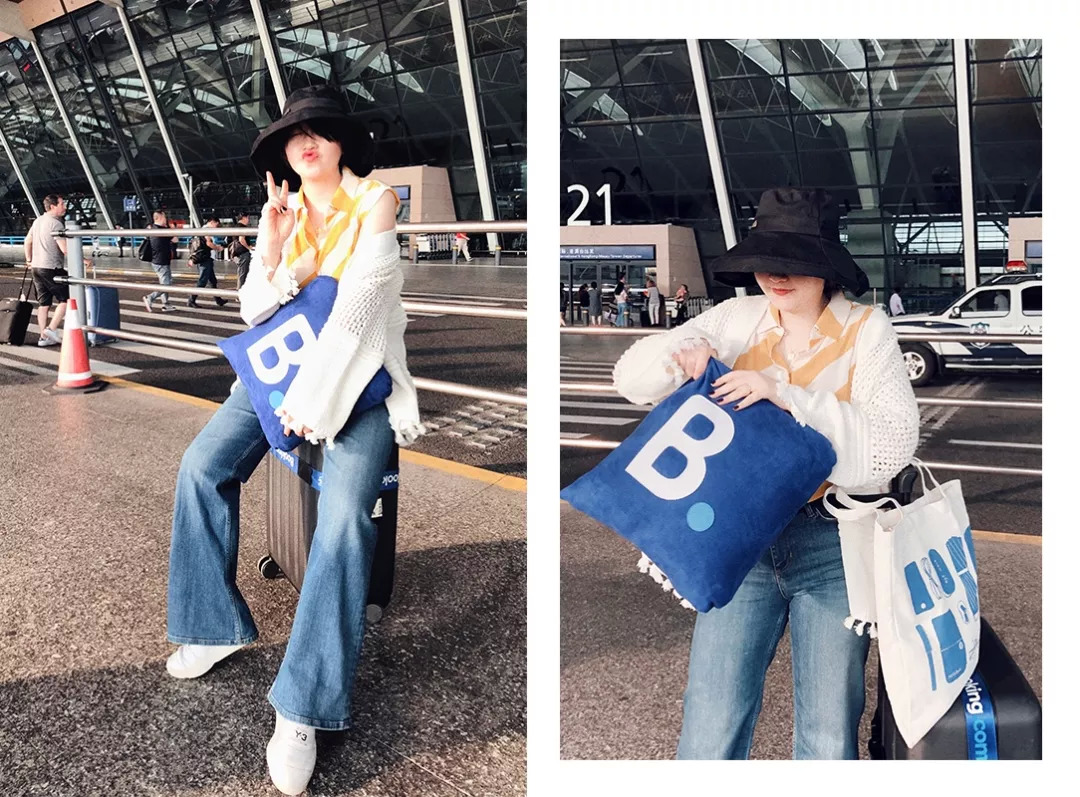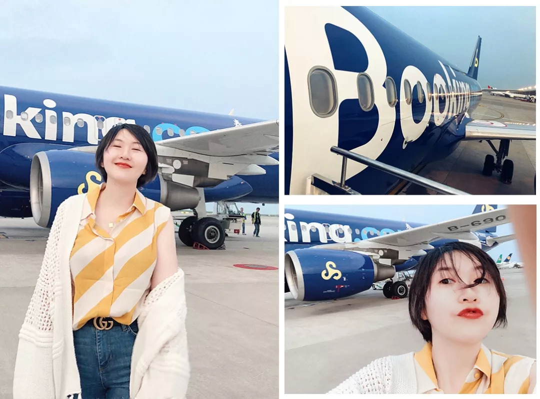 登机的时候才发现,原来这艘飞机跟普通的春秋航线不同,机身竟然是全蓝色。原来,这架是春秋和Booking联合打造的全球第一架全喷绘飞机~萌萌的机身,让从来不自拍的2饼竟也完全破功。