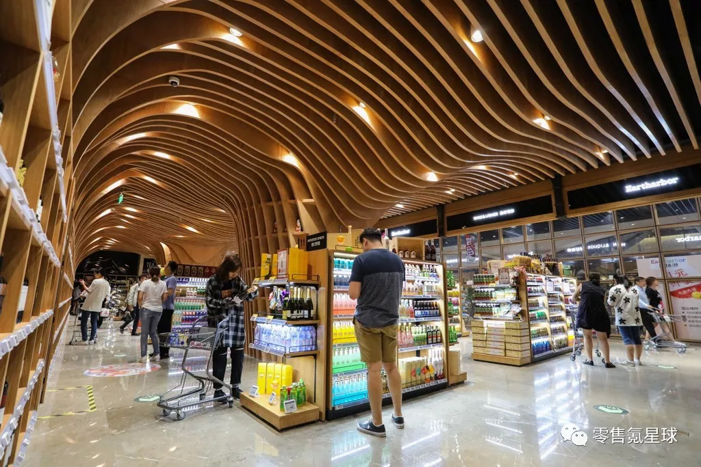 进入大门,一层生鲜餐饮区,使用全大理石地面和台面装修。在二层食百区,独具艺术气质的流线型穹顶货架一体设计令人印象深刻。
