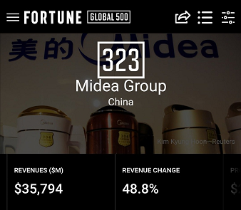 美的集团排名大幅跃升,从2017年的450位跃升至今年的323位,一下子将127家世界500强企业甩在身后。
