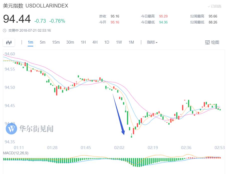 上述白宫官员消息传出后,本周五美元指数短线下跌,一度触及94.36刷新日低,日内跌约0.8%,目前跌幅收窄,回到94.40上方。周四特朗普言论发布后,美元指数从95.44处跌破95关口,刷新日低至94.90。