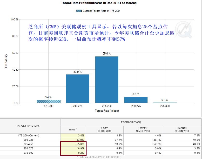 特朗普评论美联储加息当天,本周四芝加哥商业交易所(CME)的“美联储观察工具”显示,目前美国联邦基金期货交易市场预计,今年9月联储加息至少25个基点的概率超过88%。若以每次加息25个基点估算,截至12月末,至少合计加息四次的概率超过60%。