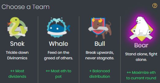 他们分别是获得最多分红的 Snek 玩蛇队、给奖池最多资金的 Whale 水鲸队、中庸选择的 Bull 疯牛队以及让当前回合 ETH 最多的懒熊队。