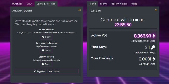 这个游戏的网站域名叫做 exitscam.me,翻译过来就是「离开骗局的我」,搭配这个 Fomo 的游戏名,可以说是非常合适了。