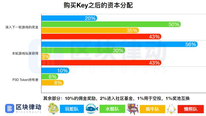 可以看到,玩蛇队的会把更多的钱给本局玩家,水鲸队会把更多的钱放入下一轮,懒熊队则选择不给 P3D Token 的持有者分红,疯牛队好像一点也不疯,非常中庸的选择。