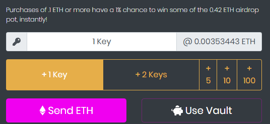 没错,在 Key 的价格越便宜的时候买越多越好,买的越多,你在后期可以分享的分红就越多。比如你是第一个购买的人,买了 100 个 Key,只花了你 1 块钱的 ETH,但是到后期,别人需要花 100 块钱的价格去买 1 个 Key,别人的成本是你的 10000 倍。