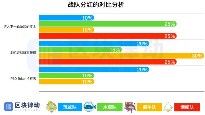四个战队的收益分成比例基本保持平衡,比如选择疯牛队的,会获得 30% 的投资返还,但是也要拿出 10% 滚入下一轮,而且还要给 P3D Token 持有者分 10%;懒熊队则只需要把最后的收益五五开,就可以不给 P3D 持有者分红。