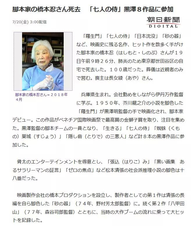 桥本忍逝世了,享年100岁。