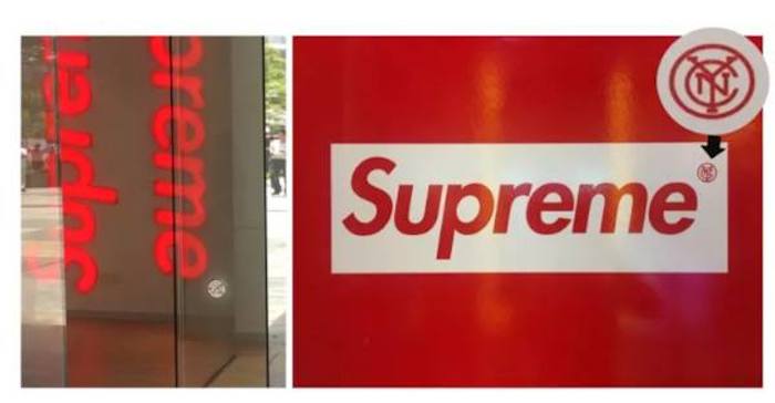 首先是品牌名称,这家专卖店的所有者“巧妙”地使用了Supreme NYC的单词组合,避开了和正版Supreme撞车。再来是LOGO,Supreme NYC保留了Supreme红底白字的设计,还在右上角加了一个乍一看以为是商标标志的小圆圈,设计成了NYC的样子。接着,这个新名字和新LOGO的组合被打包进行了工商注册,被法律“保护”了起来。