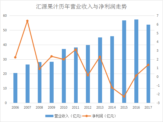 2018年4月中旬,汇源果汁发布了未经审计的业绩报告。该报告显示,2017年,公司收入为53.82亿,同比下降6.26%;净利润为1.35亿,同比大涨10.35倍。下图为财联社根据公告绘制的汇源果汁历年营业收入与净利润: