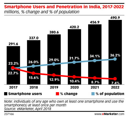 根据eMarketer的最新预测,2018年印度将有3.37亿人使用智能手机,相当于超过1/4的人口。这一用户数量同比增长近16%,比其他任何国家的增长率都高。