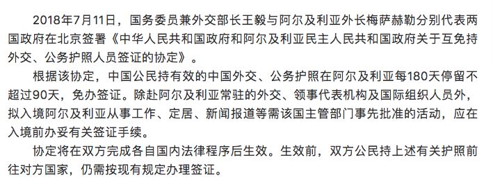 ◆签证:目前中国与阿国已签署互免签协定:中国公民持有效的中国外交、公务护照在阿尔及利亚每180天停留不超过90天,免办签证。协定将在双方完成各自国内法律程序后生效。生效前,双方公民持上述有关护照前往对方国家,仍需按现有规定办理签证。