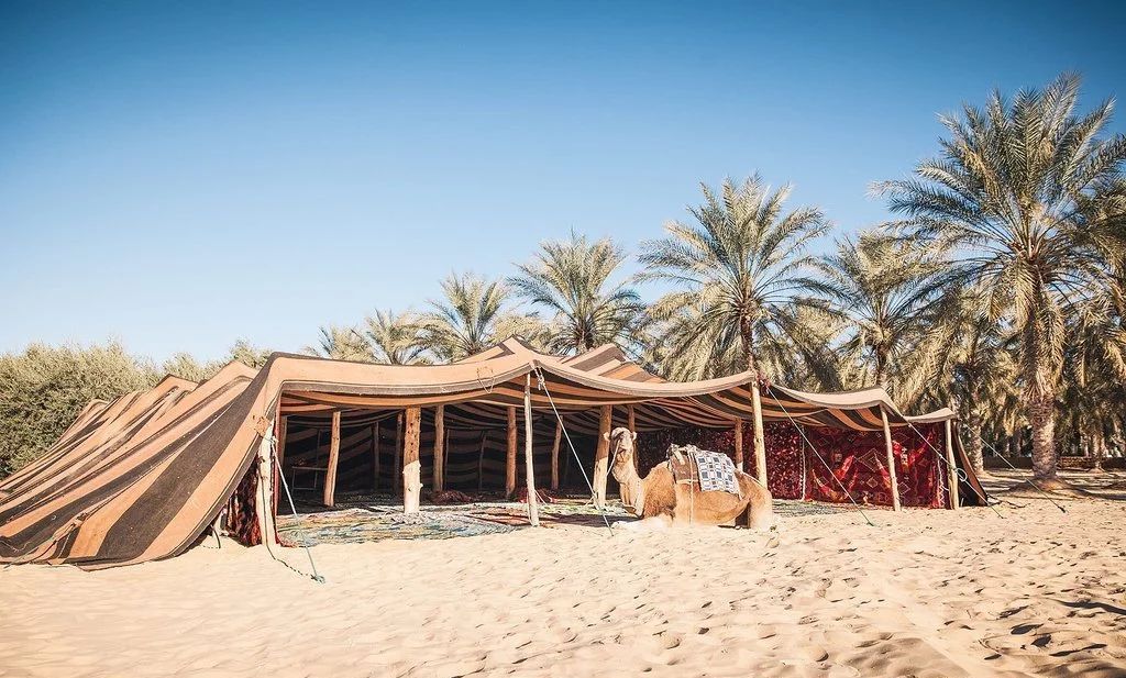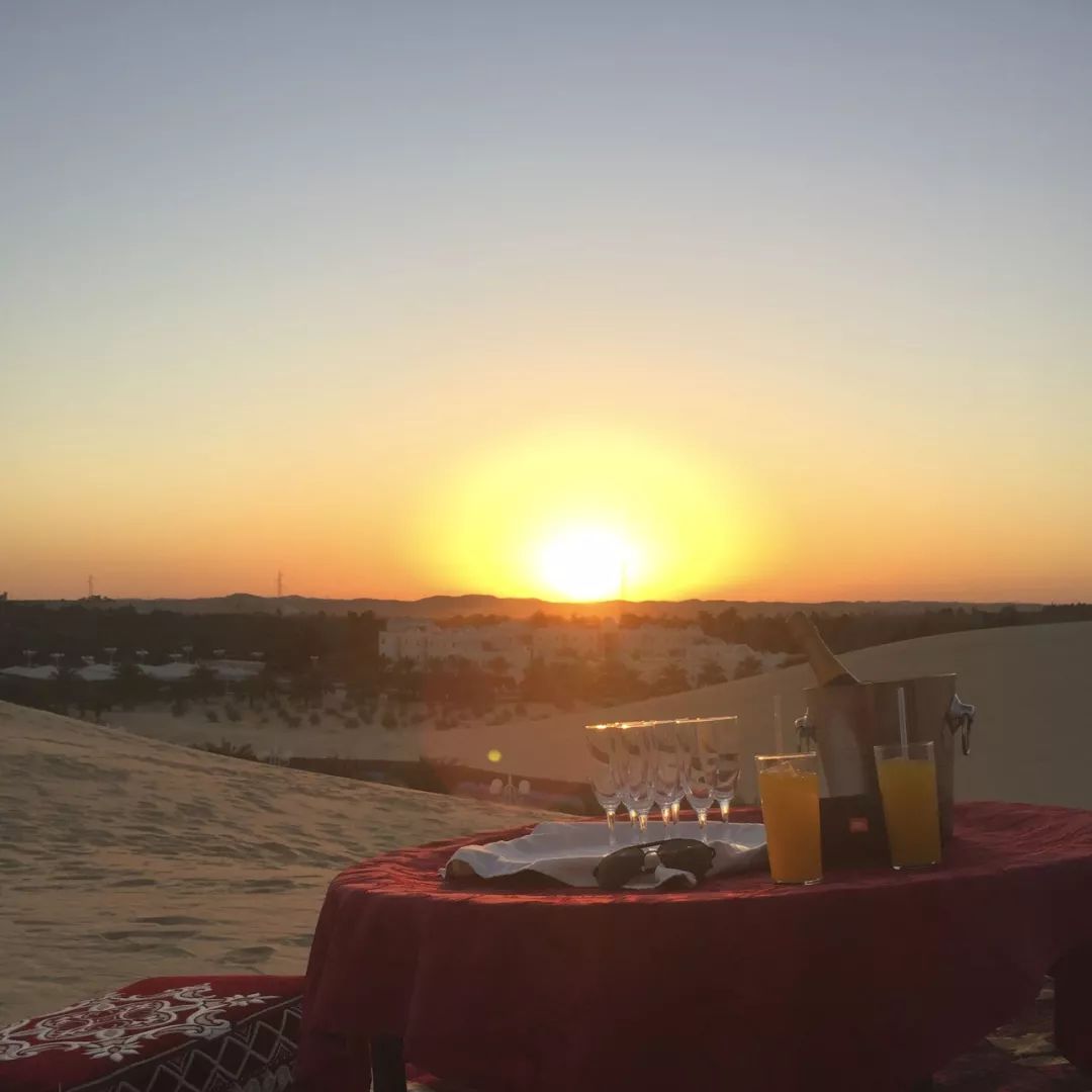 “葡萄美酒夜光杯”只有到了这里才得以体现。一边坐看撒哈拉磅礴的日落景观,一边以天为庐以沙漠为家,品茶当地最负盛名的薄荷茶或轻轻晃动高脚玻璃杯对酒当歌。