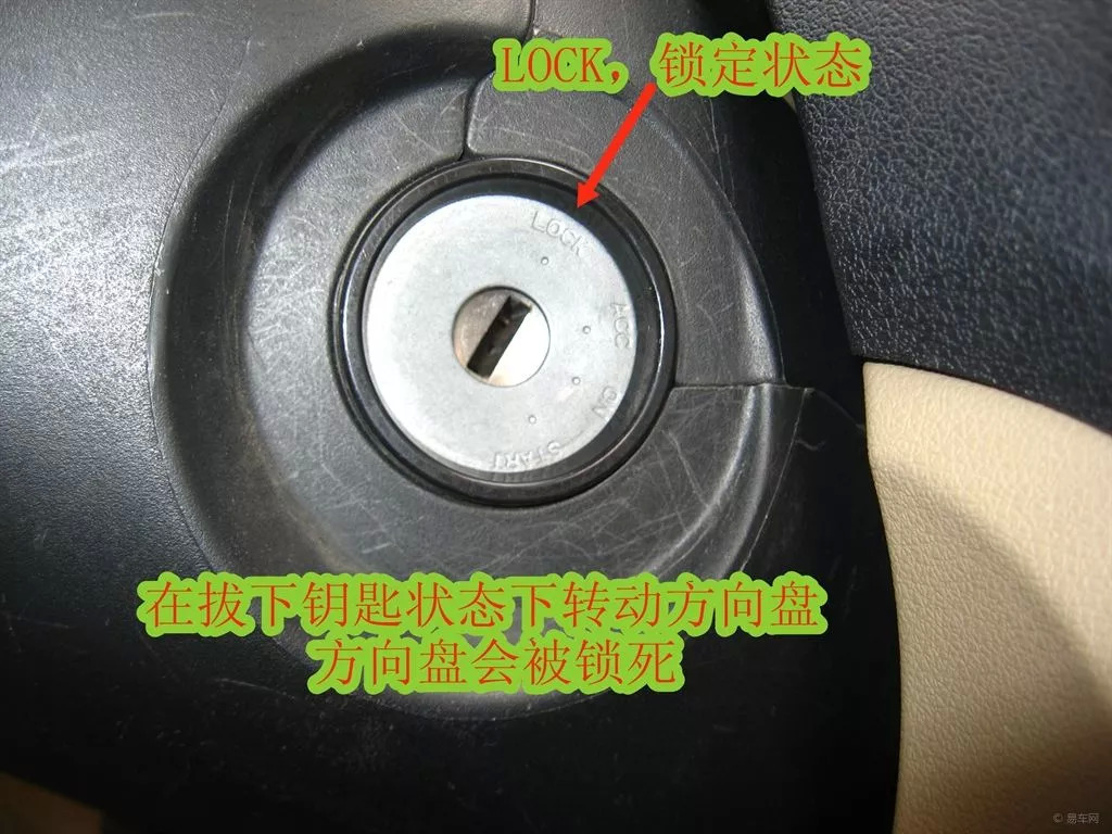 市面上所有的车辆方向盘上都有自带一个锁槽,一旦车辆处于熄火锁车状态下,方向盘柱出现转动,都会激活锁槽上的锁舌伸出。这样一来方向盘就出现 “卡死”,钥匙拧不动的情况。