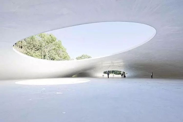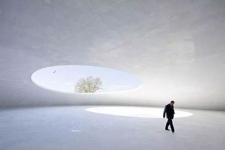 建筑天顶的圆形开口让光影在内部产生对话,观众行走在空无一物的内部,视觉、听觉和对周边的感知能力都会被放大。