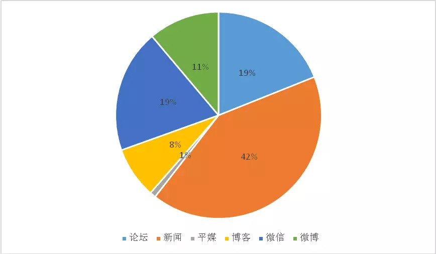 媒体分类上,新闻类传播占比最高,占总传播量的42%;其次是论坛、微信和微博,分别占传播量的19%、19%和11%;博客、平媒则分别占总传播量的8%、1%。