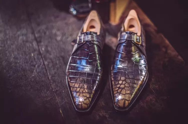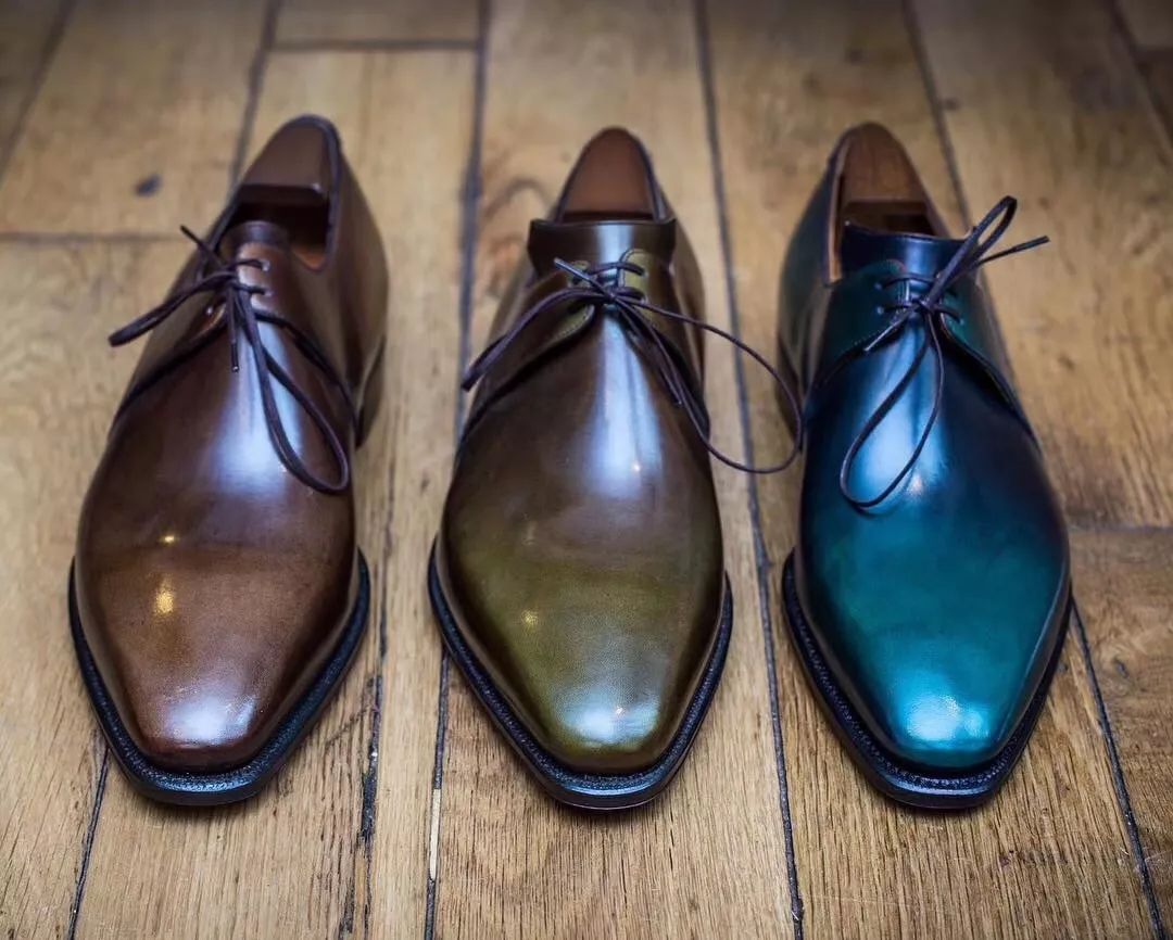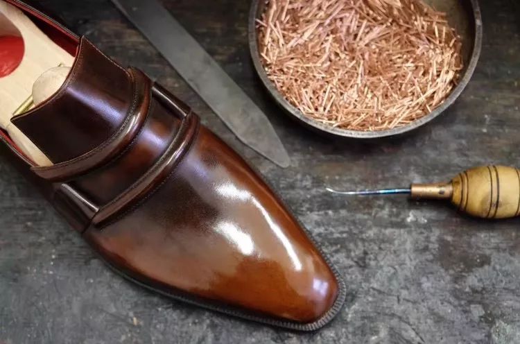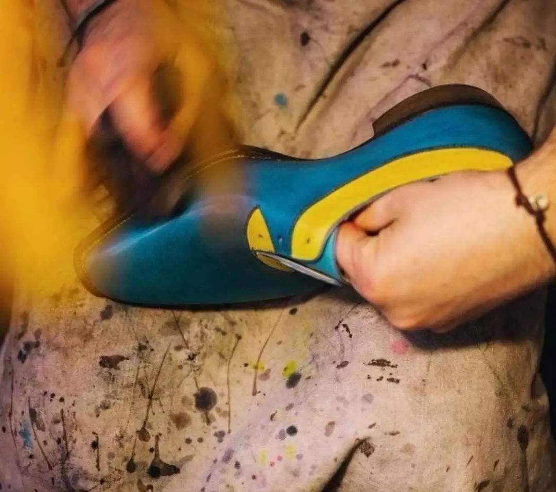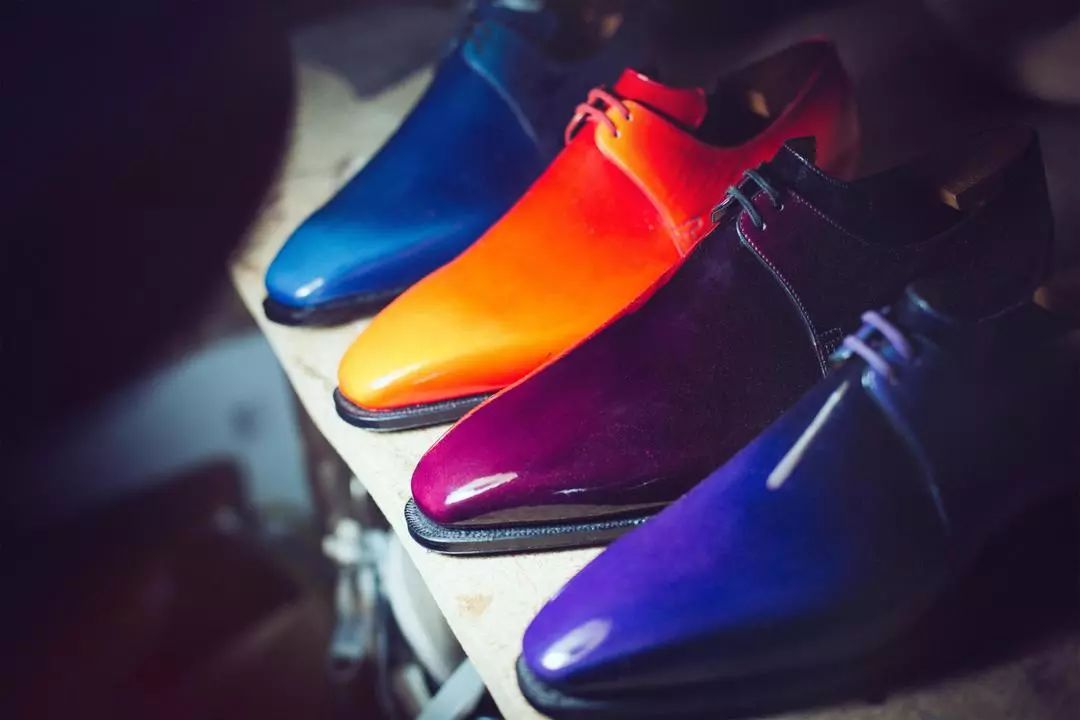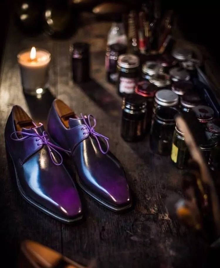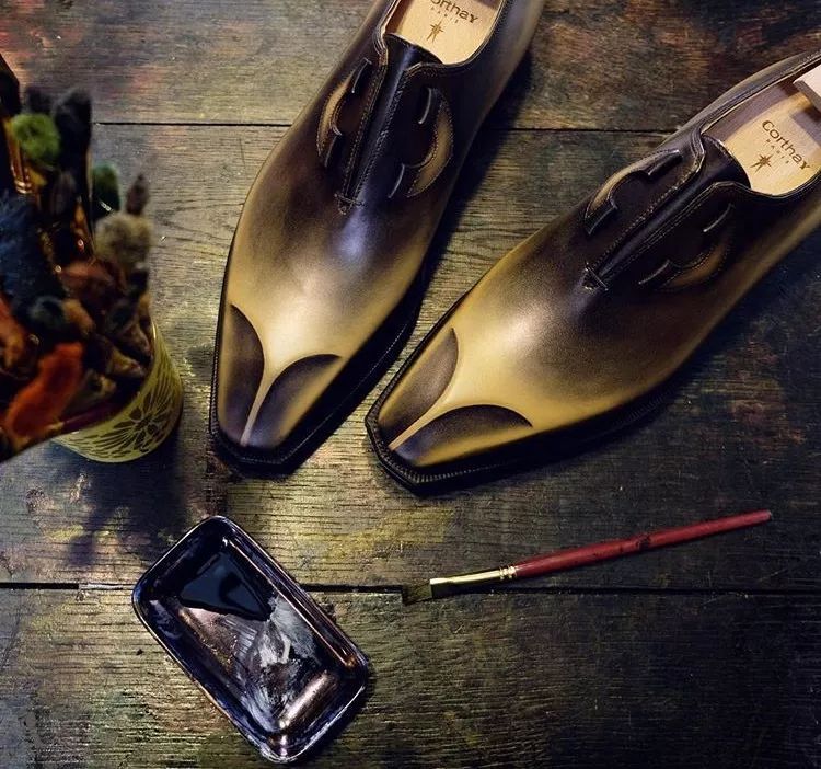 我们过去对男鞋的印象,无外乎黑色、咖啡色等几种单一的颜色,但是Corthay却可以让客人”自定义颜色“,即使是同一款鞋子,也可以通过转色幻化出不同颜色和风貌,或对比或渐变,甚至可以根据客人要求,在店内现场完成手工擦色。