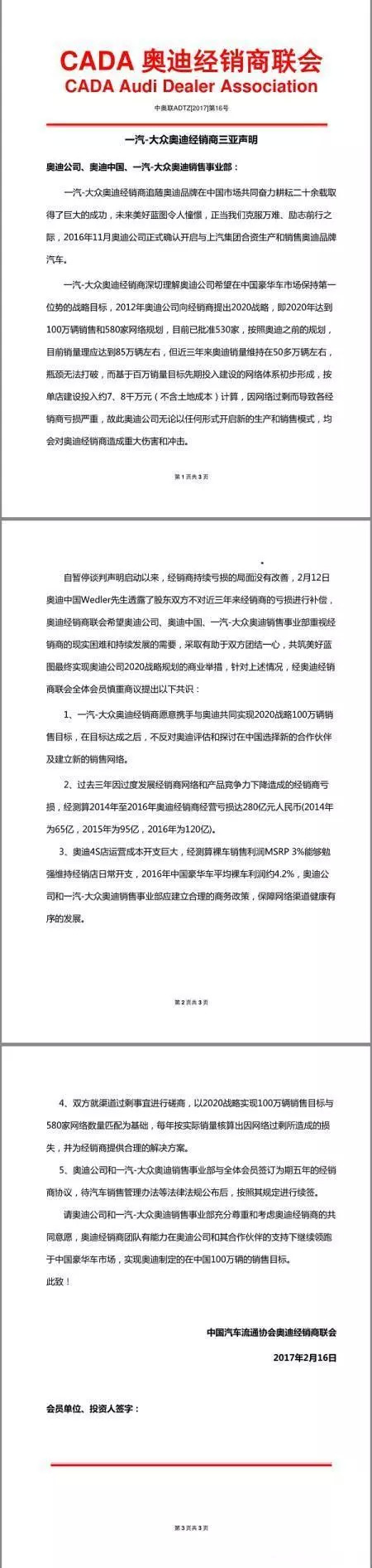 2016年11月,上汽大众与奥迪签署建立在华合资企业制造销售奥迪车型。合作公布后,一汽奥迪经销商纷纷表示不满,抱团在三亚成立奥迪经销商联盟。最后奥迪与一汽经销商联盟达成共识,暂时搁置与上汽大众合作事宜。