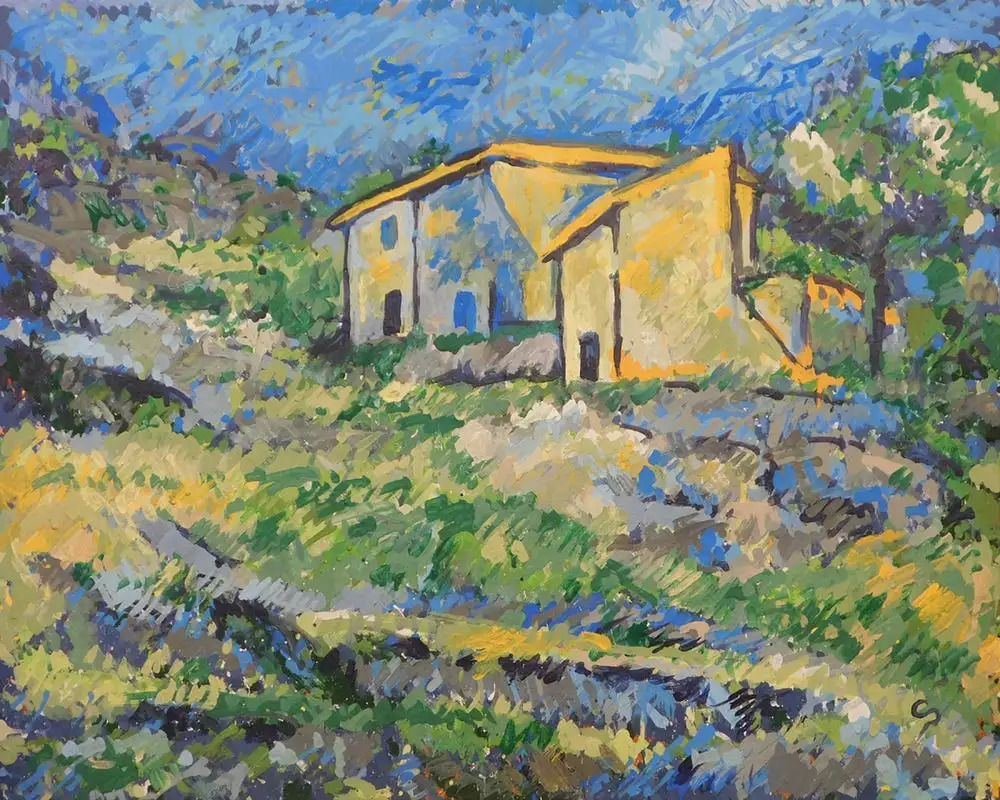 获得今年赛事冠军的机器人CloudPainter(上图)及其作品。中图是其再现的保罗·塞尚名作《HousesattheL'Estaque》。下图是其原创画作。