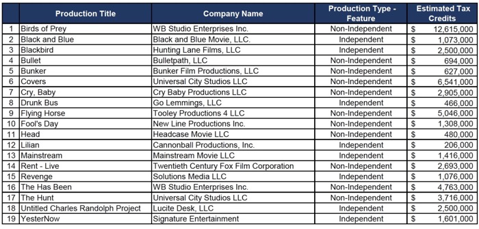 本轮提供的税款抵免共计约5220万美元,除了《猛禽小队》与《飞马》以外,名单上还有制作过程严格保密的环球影业新作《Covers》、本·阿弗莱克与导演加文·欧康诺再度合作推出的运动剧情片《过时之人》(The Has-Been)、以及福克斯电视台将于明年1月27日首播的《Rent Live》节目,具体名单及分配计划详见下表: