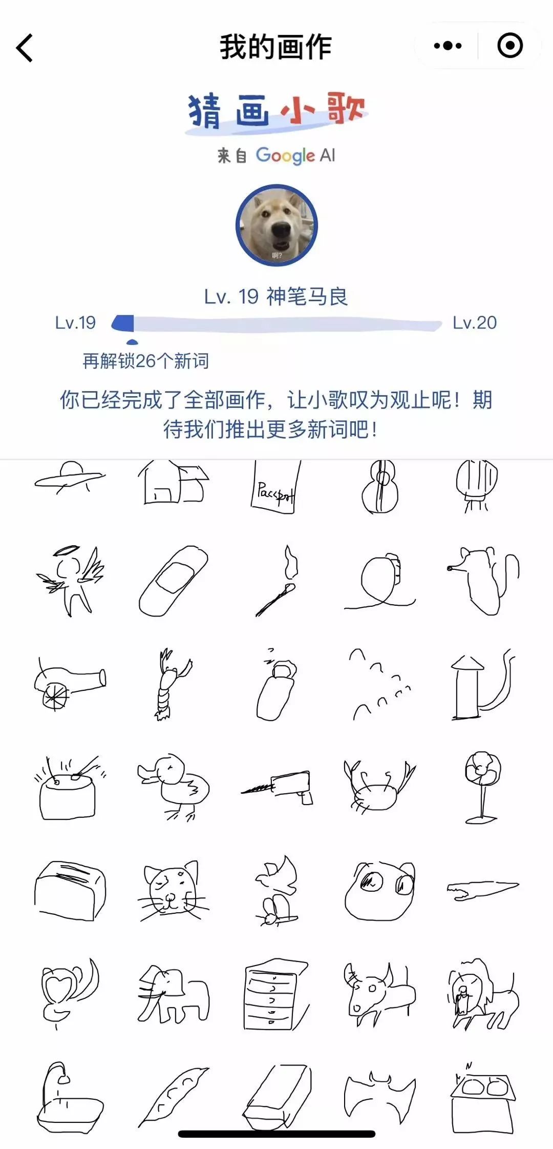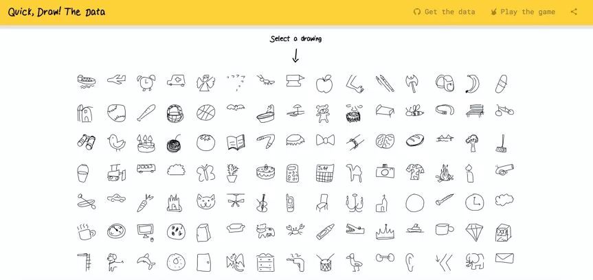 据谷歌介绍,“猜画小歌”背后的技术主要是计算机视觉和神经网络,该网络源自全世界最大的、囊括超过 5000 万个手绘素描的数据群,可见,“猜画小歌”上线前,就已经受过严格训练,有一套强大的算法了。如下图,谷歌所有出的猜画题,其实已经有着大量的手绘素描的数据群,你这边一边画,另一边神经网络进行快速比对。